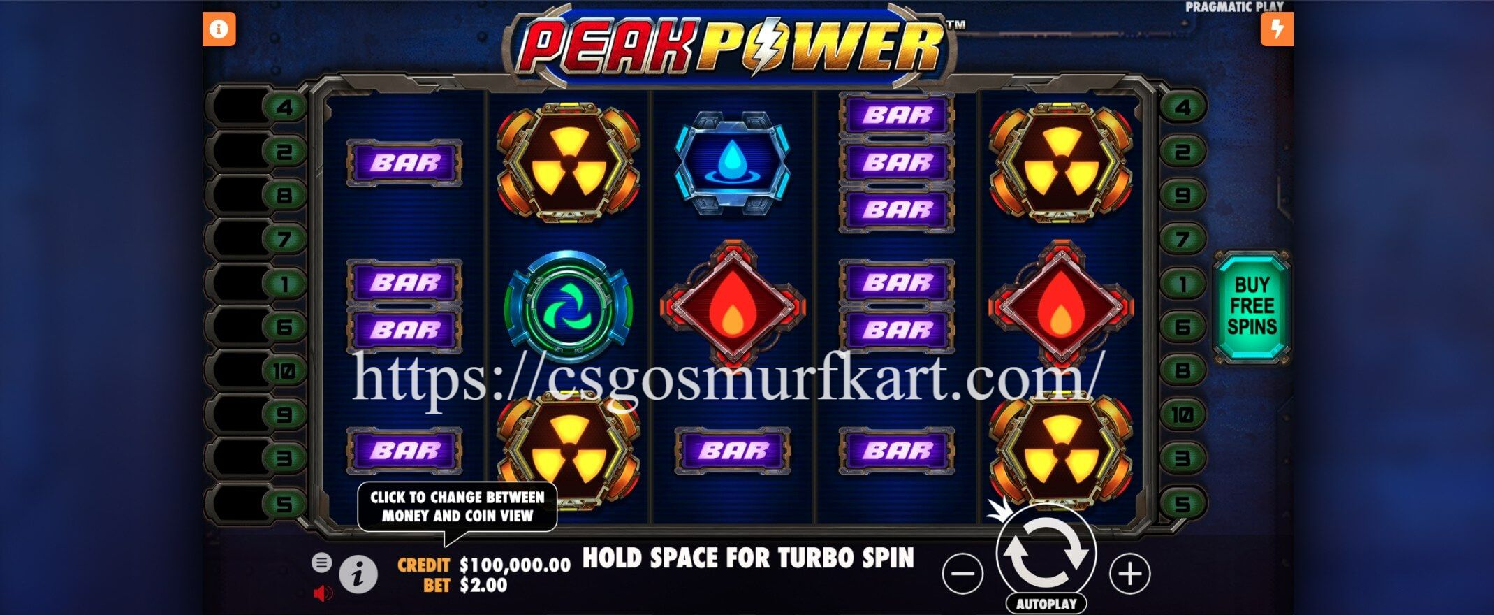 Peak Power menampilkan latar reaktor energi raksasa dengan cahaya menyala, indikator daya, dan efek ledakan saat energi mencapai level maksimum. Desain visual modern dan agresif memperkuat tema kekuatan. Simbol-simbol yang hadir antara lain: